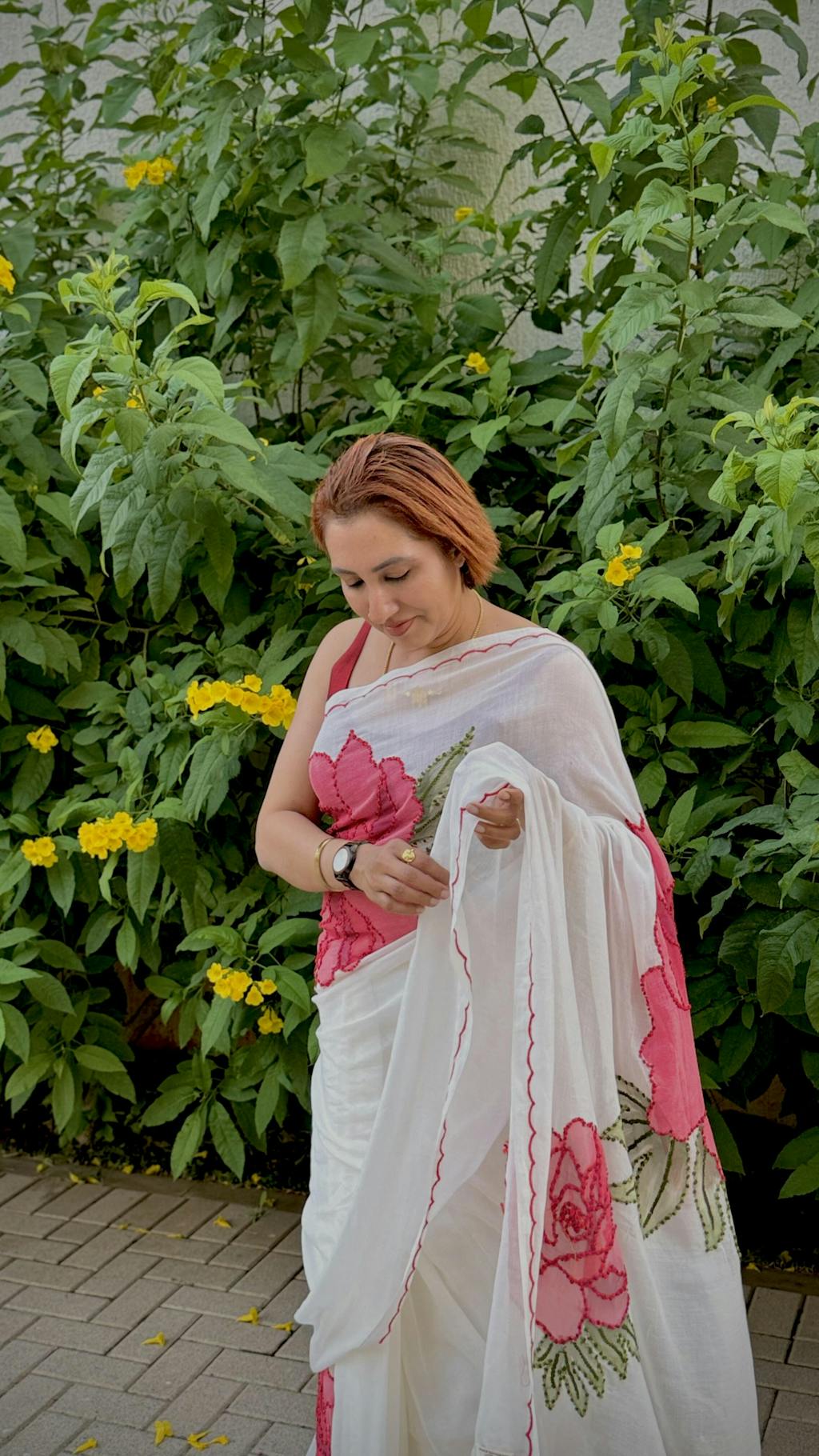 The model is wearing size S blouse and sarees are Aman Naina, Which Phool