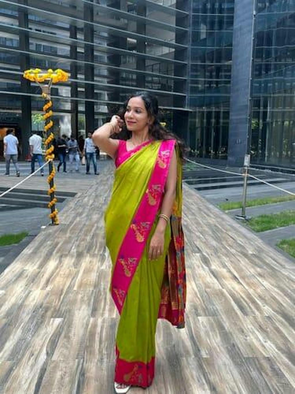 Blouse : The model is wearing size S blouse and the saree is Holud Kusum