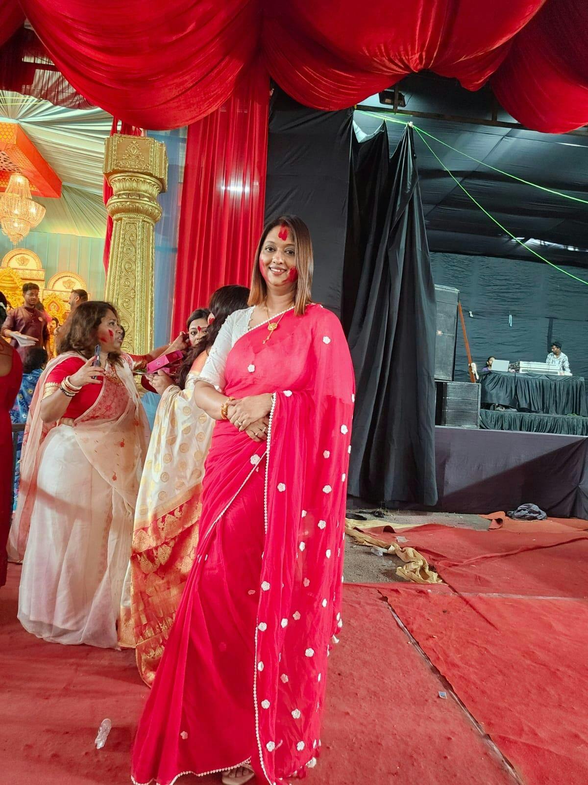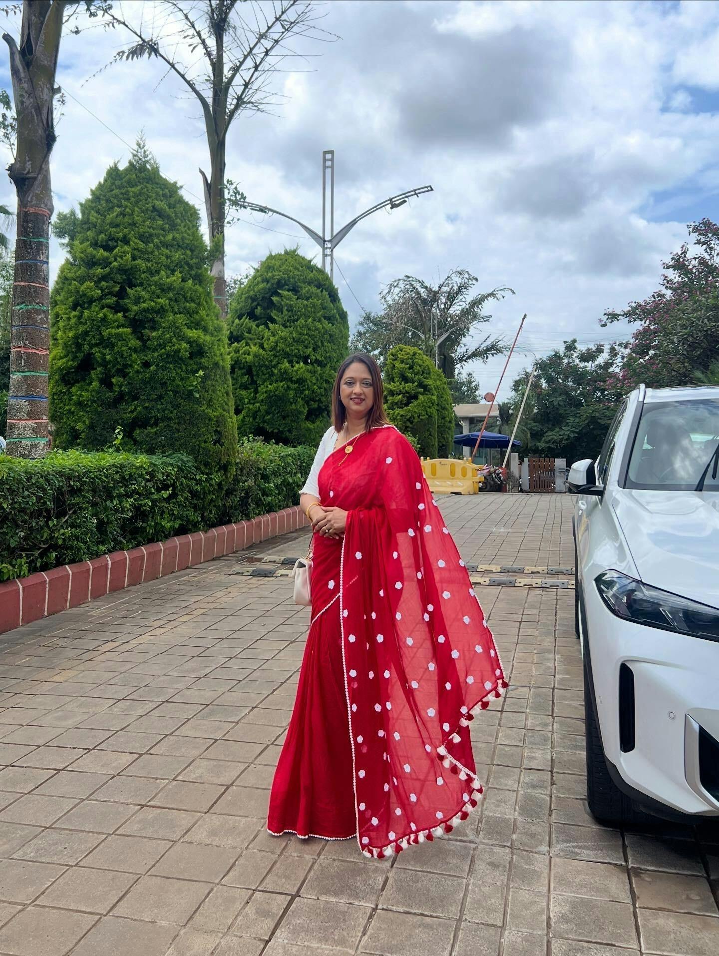Pujo Dhaak is handcrafted from buttery-soft mul cotton fabric in a vibrant red hue. This saree aims to evoke the sensation of your heartbeat syncing with the rhythm of the dhaak. It features handmade crochet flowers that are hand stitched all over the body of the saree. Complemented by beautiful gold lace along the border. The lightweight fabric ensures comfort as you immerse yourself in the dhunuchi naach. Adding a touch of class and capturing the festive spirit, this saree is the perfect drape for this Pujo!