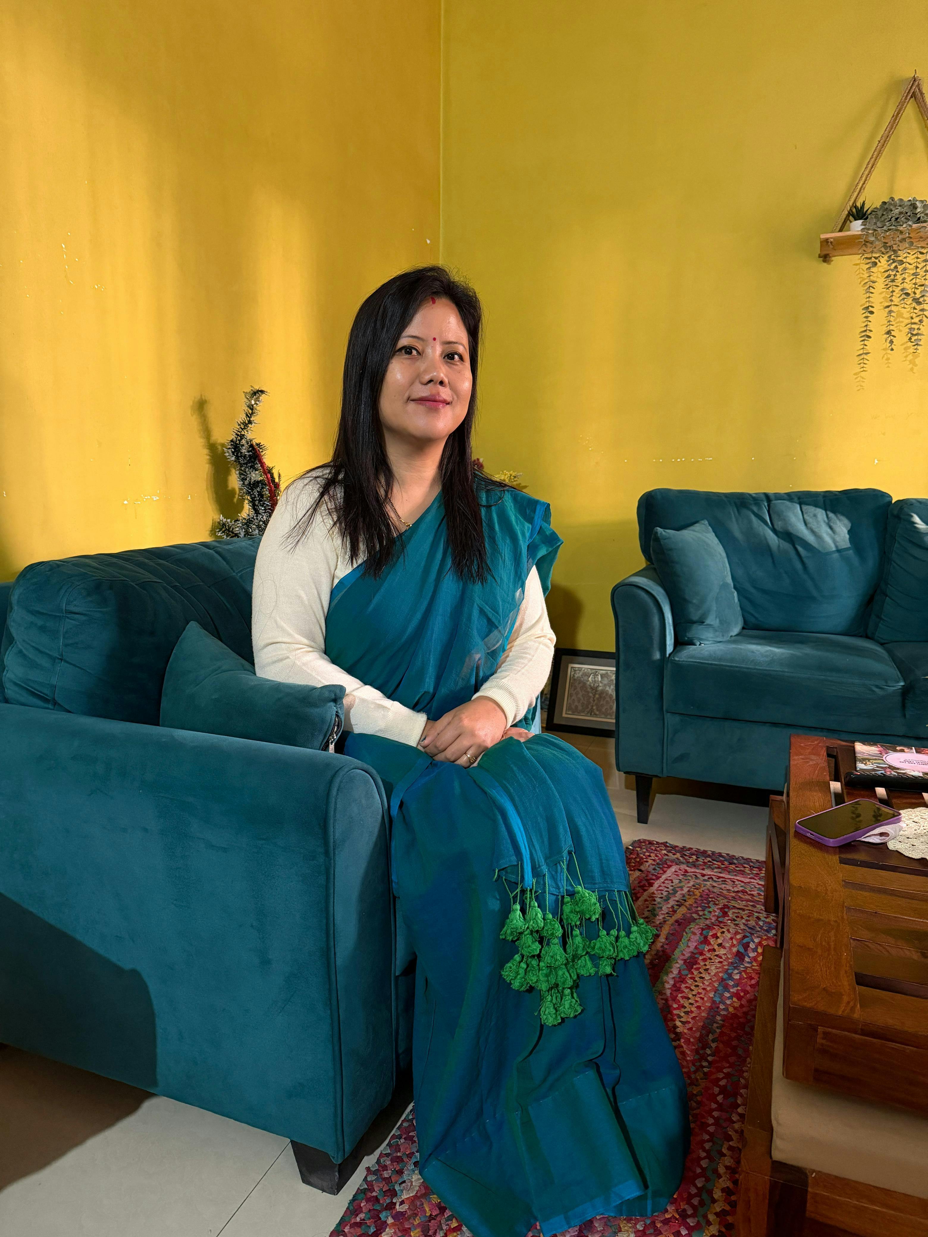 Light played hide and seek as the day got ready to pull up its socks and retire to bed. The imminent night-time hesitantly came forward and stood in line as it knew its arrival was scheduled. As both day and night awaited the right time to exchange places, the twilight danced its happy dance while it brought out the spell-binding shades of nature. Behold the sight! The hour was just right for the pond to turn golden and the moss to shine like emeralds. This super pretty Made in Heaven mul saree in a rich blue-green colour is just what you need to drape on yourself to face the world with poise and style!