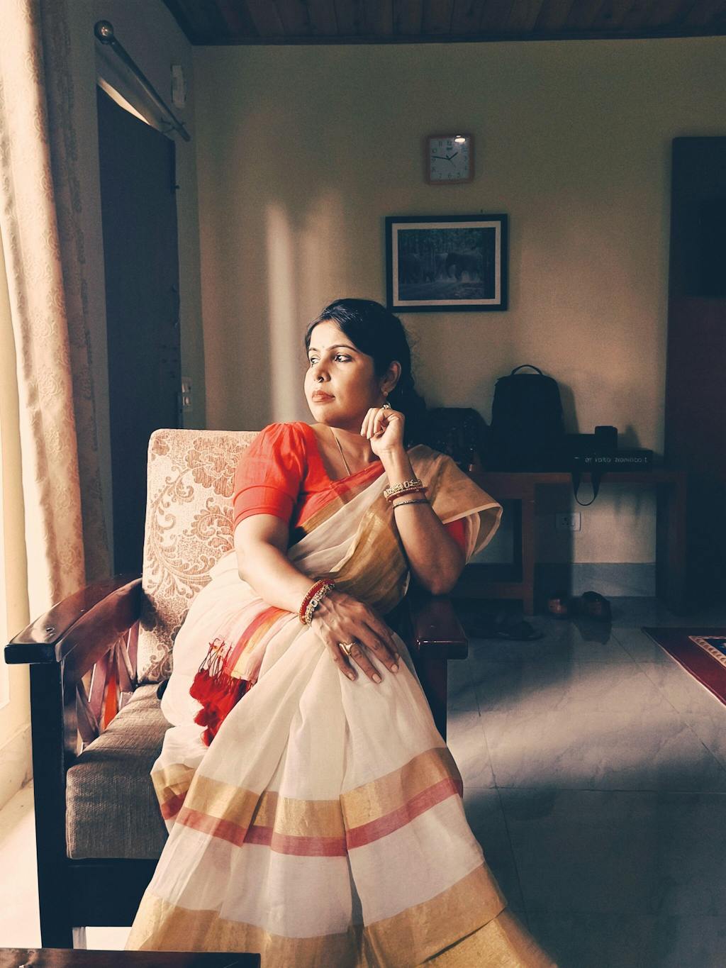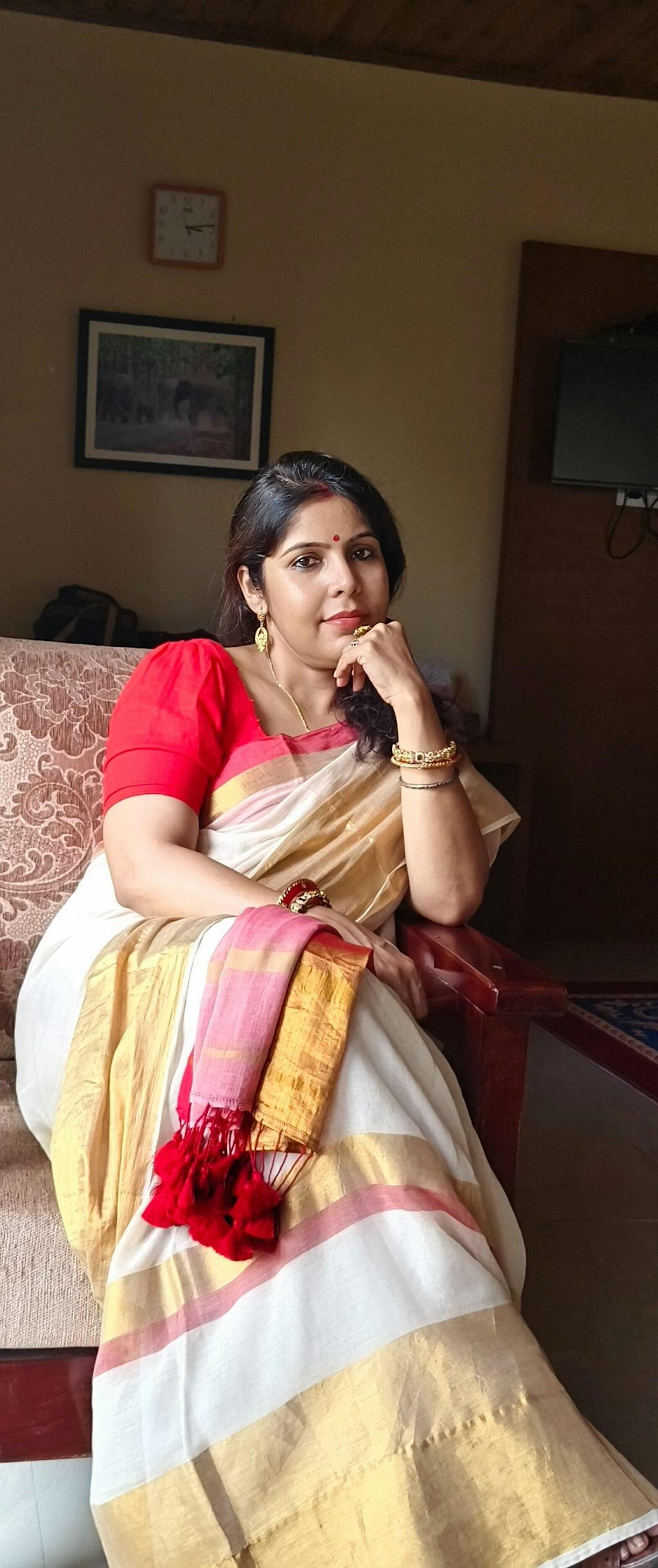 She was a testament to beauty that transcended time's grasp. Her features, like chiselled marble, were an artistry that nature itself couldn't replicate. Grace flowed through her like the hand of a master sculptor, etching elegance into her every gesture. Yet, her allure went beyond the external her heart was as enduring as stone, a foundation of compassion and strength. She was a masterpiece in motion, a sculpture of character carved by life's trials. In her permanence, she defied impermanence, an exquisite embodiment of both artistry and resilience.This gorgeous off-white cotton zari saree, with gold and red embellishments, is a testament to your immovability and your enduring presence.