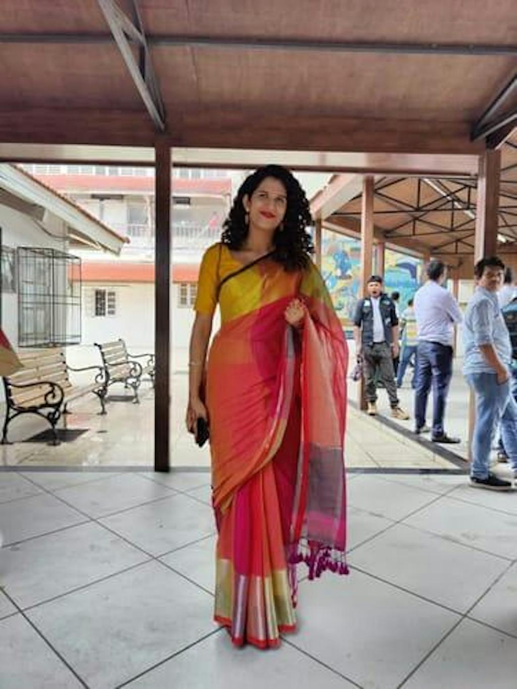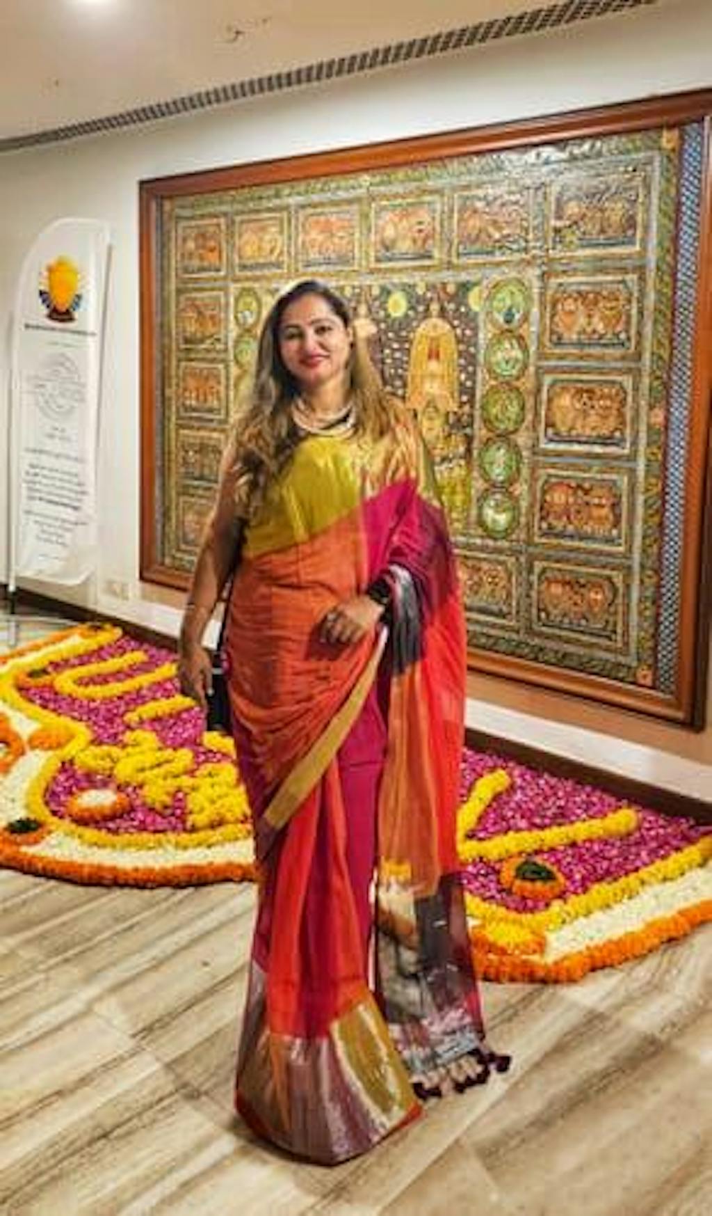 Spread your radiance when you wear this stunning gold, orange, pink and maroon saree, made of cotton-zari.