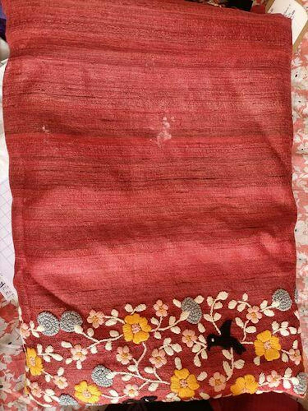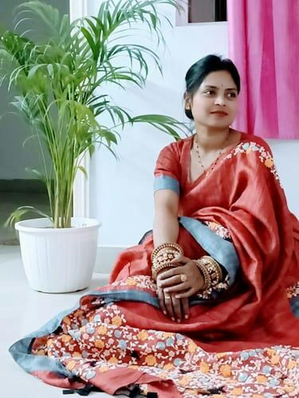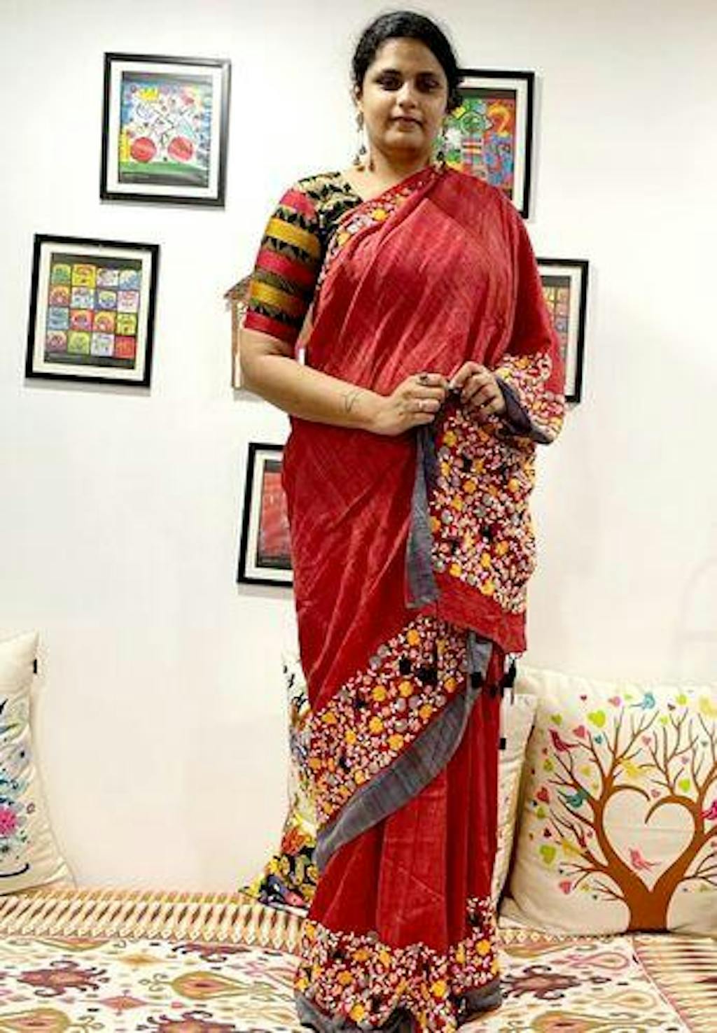 This is a red Tussar Ghicha silk saree handwoven with love and adorned with exquisite hand-embroidered detailing!